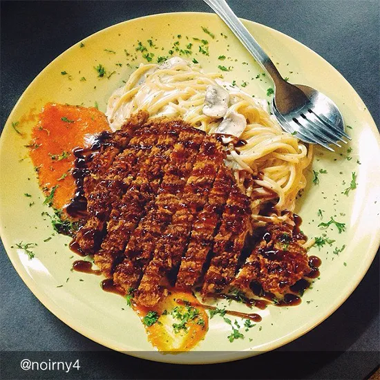 ร้านนี้มี Wi-Fi ด้วยนะ เจ้าของร้านน่ารัก ใจดี อาหารก็ระดับพีค คือเอามาเสิร์ฟแล้วจานเท่าบ้าน แต่ทำไมมันถูกมากกกกก ไม่ถึง 100 บาท รสชาติเป็นสไตล์ญี่ปุ่น เน้นหมูทอด แล้วก็ถ้าไม่พอใจก็เพิ่มชีสได้ตามใจชอบ ใครชอบได้เยอะ ๆ สะใจ แนะนำให้มา