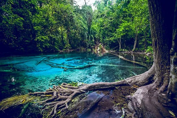ตั้งอยู่ที่อำเภอคลองท่อม ในเขตรักษาพันธุ์สัตว์ป่าเขาประมง โดยมีต้นกำเนิดมาจากธารน้ำอุ่นในผืนป่าที่ราบต่ำภาคใต้ ไฮไลท์อยู่ที่นักท่องเที่ยวจะได้ชื่นชมกับสระน้ำธรรมชาติที่มีสีเขียวเหมือนมรกตขนาดใหญ่ และมีความใสจนมองเห็นพื้นหินข้างล่างได้อย่างชัดเจน รอบ ๆ บริเวณยังมีศาลาเอาไว้ให้นักท่องเที่ยวได้นั่งพักผ่อน ชมวิวทิวทัศน์ รวมถึงยังได้เพลิดเพลินกับการว่ายน้ำเล่น ท่ามกลางร่มไม้ใหญ่แบบชิล ๆ
