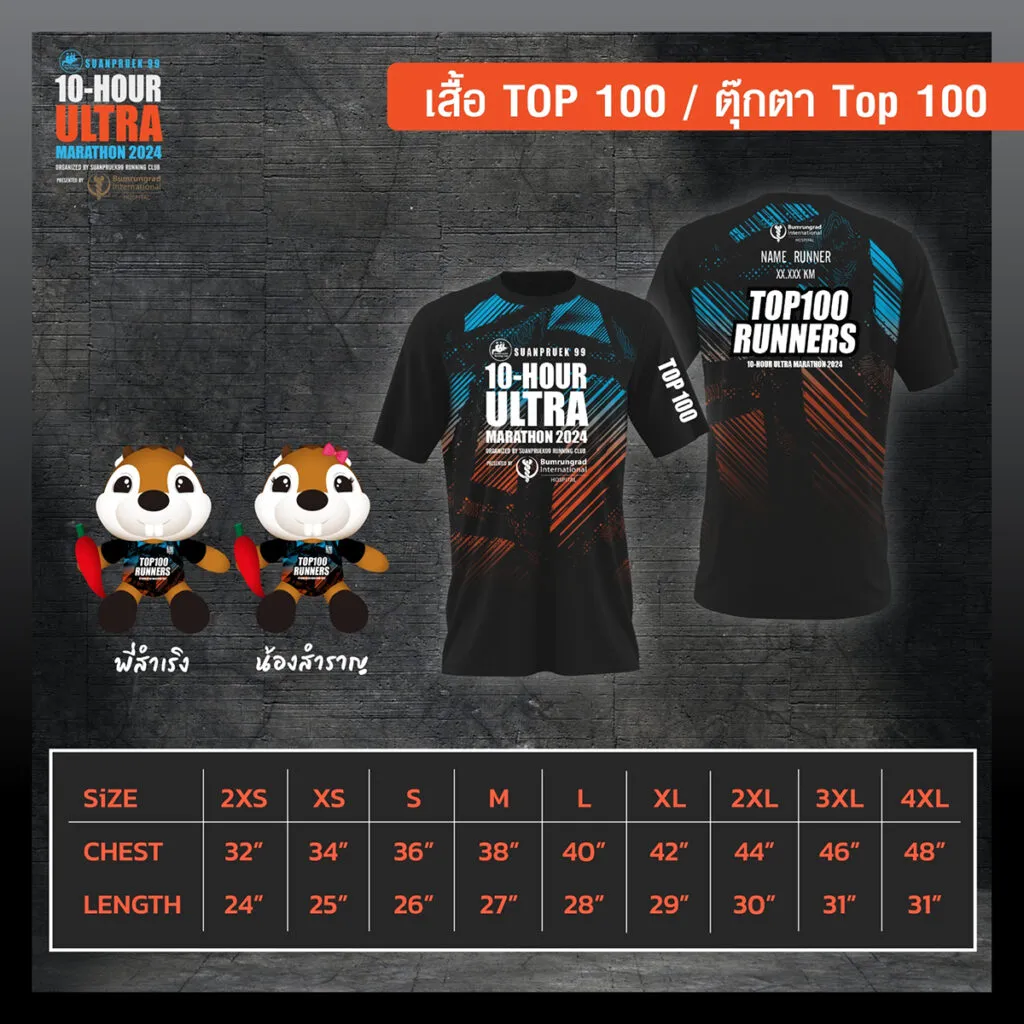 Top 100 male and female runners will receive running shirt âTop 100 Runnersâ and limited edition dolls âāļāļĩāđāļŠāļģāđāļĢāļīāļ & āļāđāļāļāļŠāļģāļĢāļēāļ.â ( Running shirt âTop 100 Runnersâ will be delivered within 20 days. The shirt size will be as requested, and the name of runner will be printed on the back.)