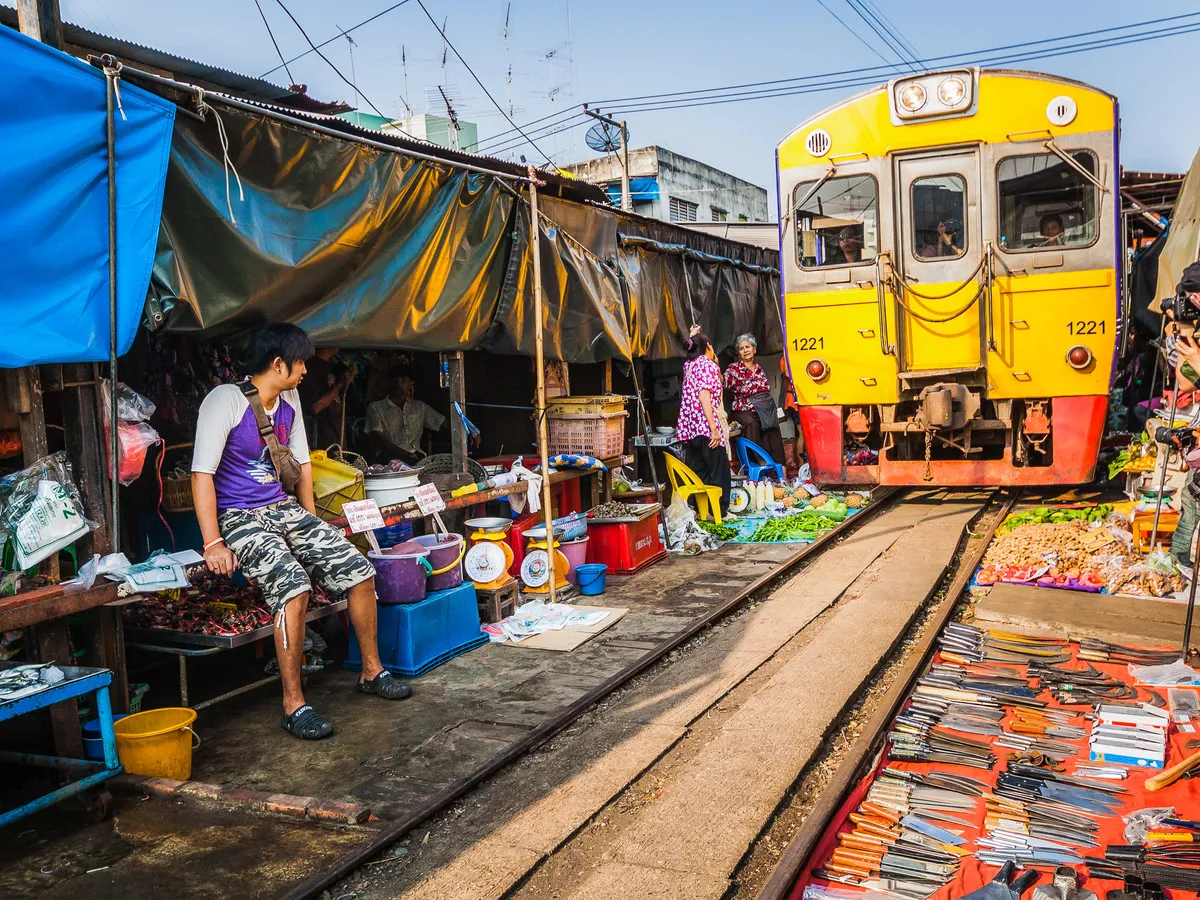 ตลาดร่มหุบ จ.สมุทรสงคราม ตลาดขายสินค้าบนรางรถไฟ เมื่อรถไฟผ่านมาพ่อค้าแม่ค้าจะรีบหุบร่มกันอย่างพร้อมเพรียง และเมื่อมาถึงสมุทรสงคราม ก็พลาดไม่ได้กับซื้อปลาทูแม่กลองอันแสนอร่อยและเป็นเอกลักษณ์