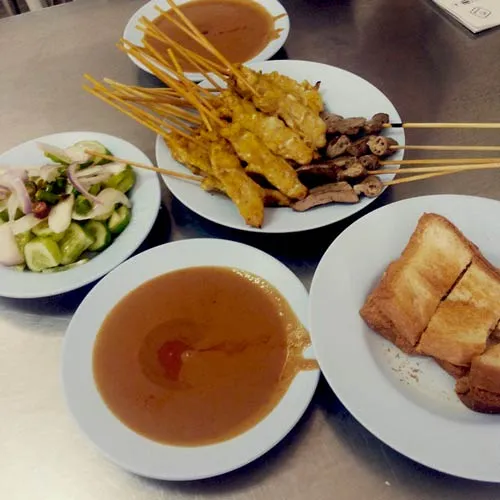 ร้านหมูสะเต๊ะที่เปิดขายมากว่า 60 ปี ซึ่งวันนี้ได้ขยายสาขาความอร่อยทั้งหมด 3 สาขา ได้แก่ ตรงสี่แยกใกล้ห้างศูนย์นักเรียนกรุ๊ป ตรงข้ามบ้านพักไทยออยล์ และเส้นโรงเรียนอัสสัมชัญ ศรีราชา ความอร่อยอันโดดเด่นของหมู่สะเต๊ะที่นี่ น่าจะอยู่ที่เนื้อหมูชิ้นบาง ที่หั่นและเสียบไม้ปิ้งขนาดกำลังพอดี ซึ่งช่วงระหว่างที่ปิ้ง ที่ร้านจะทากะทิลงไปด้วย กะทิจะซึมลงไปในเนื้อหมู เพิ่มความหอมและความนิ่มเพิ่มขึ้นไปอีก แต่ทีเด็ดของจริงน่าจะอยู่ที่ น้ำจิ้มรสเด็ด พร้อมตับกับไส้อ่อน หั่นชิ้นพอดีเสียบไม้ย่าง และขนมปังชิ้นบาง อร่อยอย่าบอกใครเลย นอกจากนี้ยังมีของทานเล่นอย่างอื่น เป็นต้นว่า "หอยจ๊อ" ราชาติอร่อย มีเนื้อปูเป็นไส้ใน อร่อยไม่แพ้หมูสะเต๊ะ บริการดี รวดเร็ว แจ่มแบบนี้ต้องมาทาน