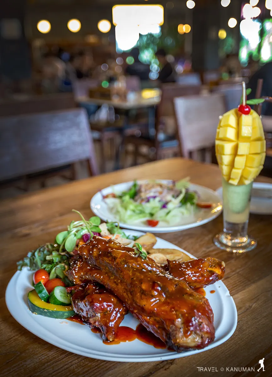 FUSION กันหน่อย ใครที่กินอาหารพื้นถิ่นมาหลายมื้อติดแล้วอยากเปลี่ยนบรรยากาศ แนะนำให้จัด “Rock Me Burgers & Bar ” Burger ดีงามมาก เนื้อเด่น กิมมิคคือ จานโต ราคาไม่แพงเลย แต่ที่โดนสุดคือ สปาเกตตี้คาโบนาร่า เส้นคลุกชีสมาเต็มๆ เบคอนกรอบมาก และที่เหนือคาดคือ เฟรนฟรายชีสเบคอนกรอบ กับ Golden Wing ด้วยสูตรไก่ทอดเนื้อนุ่มหนังมีรสกระเทียมผสมกลมกล่อมมาก
